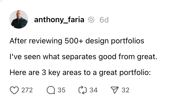 In a recent post on Threads I shared the 3 key areas that make up a great design portfolio. Below is a link to the post.